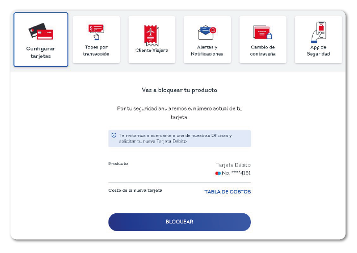 A través de Banca Virtual puedes realizar el bloqueo temporal* o definitivo de tus tarjetas o productos siguiendo los siguientes pasos¡