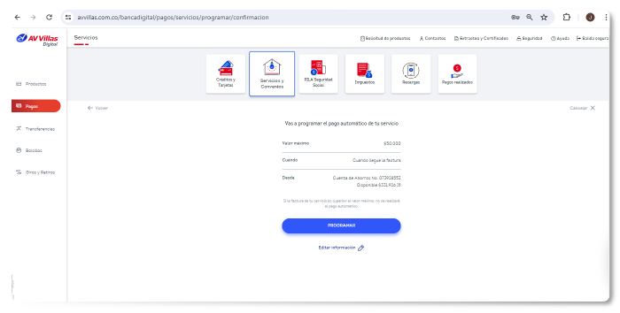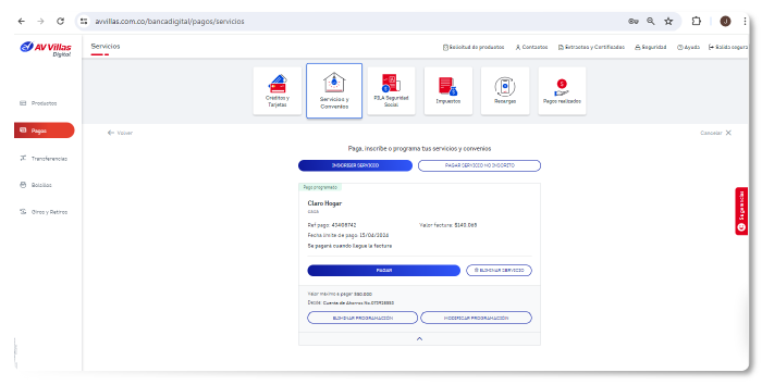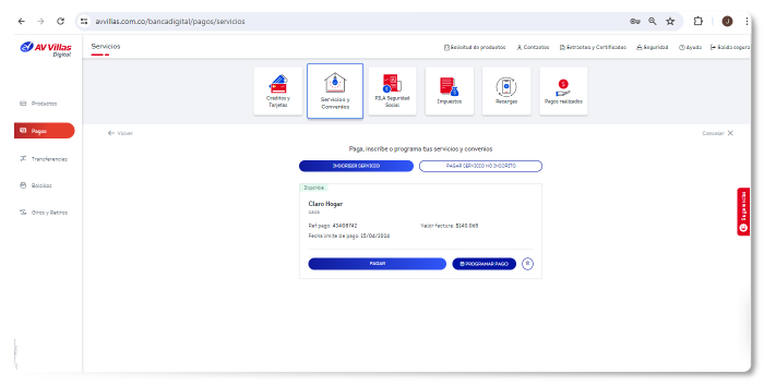 Programa el pago de tus recibos desde la banca virtual de AV Villas. Olvídate de largas filas y realiza tus pagos en línea de forma segura y sencilla Ingresa Ahora