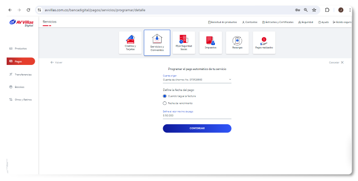 3. Selecciona la cuenta desde donde se va a debitar el dinero, define la fecha de pago y el monto máximo de pago. Ese monto que se configure es personal.